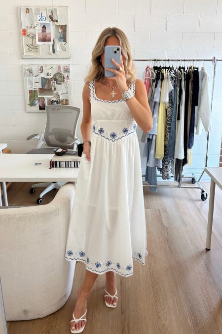 $45.00Details Ivory dress with blue embroideryMidi lengthSleevelessSquare necklinePartially linedSmocked backSide pockets Full length of a size medium from center of neckline: 41.5 inches Materials and Care Self: 100% cottonLining: 100% polyesterHand wash coldLay flat to dry All sale items are considered final sale.